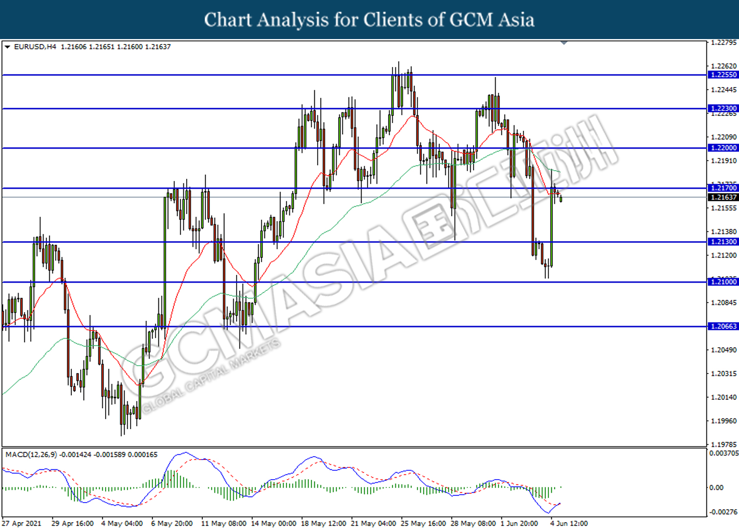 EURUSD, H1: EURUSD was traded higher following prior retracement from the support level at 1.2100. MACD which illustrated the formation of bullish momentum suggest the pair to extend its gains in short-term.