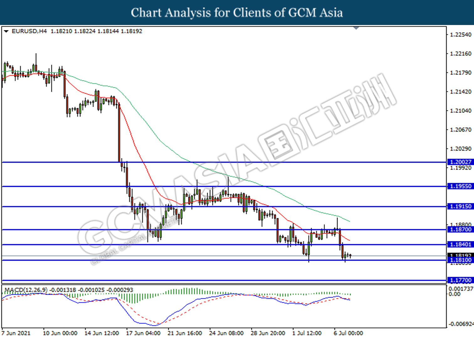 EURUSD, H4: EURUSD was traded lower following prior retrace from 1.1870. MACD which illustrated bearish momentum suggest the pair to be traded lower in short-term.