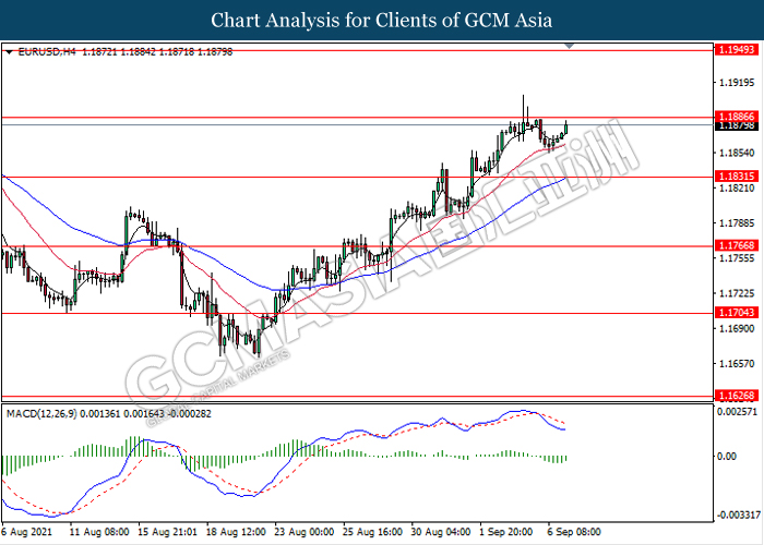 EURUSD, H4: EURUSD was traded higher while currently testing the resistance level 1.1885. MACD which illustrate diminishing bearish momentum signal suggest the pair to extend its gains after it breaks above the resistance level.