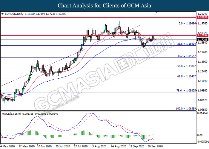 EURUSD, Daily: EURUSD was traded lower following prior retracement from the resistance level at 1.1790. MACD which illustrate diminishing bullish momentum signal suggest the pair to extend its losses toward the support level at 1.1645.