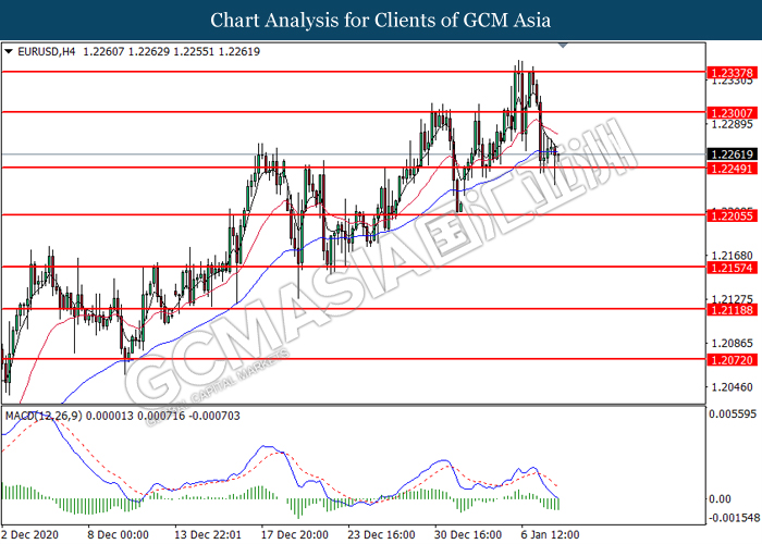 EURUSD, H4: EURUSD was traded lower while currently testing the support level at 1.2250. MACD which illustrated bearish bias momentum suggest the pair to extend its losses after it successfully breakout below the support level at 1.2250.