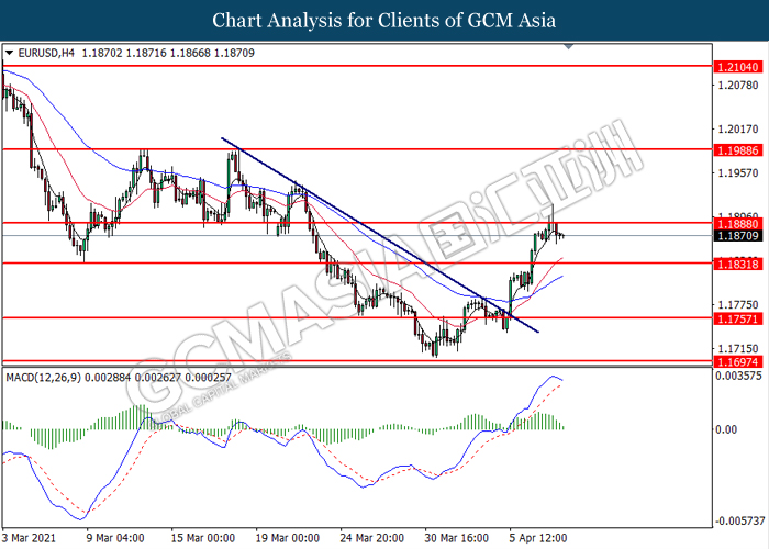 EURUSD, H4: EURUSD was traded lower following prior retracement from the resistance level at 1.1890. MACD which illustrated diminishing bullish momentum signal suggest the pair to extend its losses toward the support level at 1.1830.