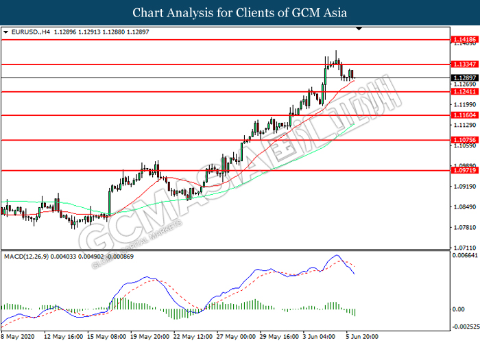 EURUSD, H4: EURUSD was traded lower following prior retracement from the resistance level at 1.1335. MACD which illustrated increasing bearish momentum suggest the pair to extend its losses toward support level at 1.1240.