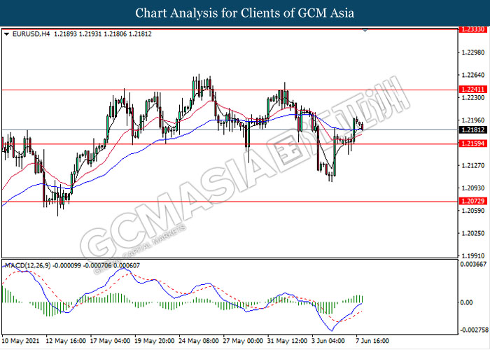 EURUSD, H4: EURUSD was traded lower following prior retracement from its high level. MACD which illustrate diminishing bullish momentum signal suggest the pair to extend its retracement in short term towards the support level 1.2160.