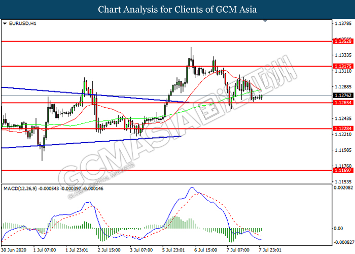 EURUSD, H1: EURUSD was lower while currently testing the support level at 1.1265. However, MACD which illustrated diminishing bearish momentum suggest the pair to be traded higher in short-term as technical correction.