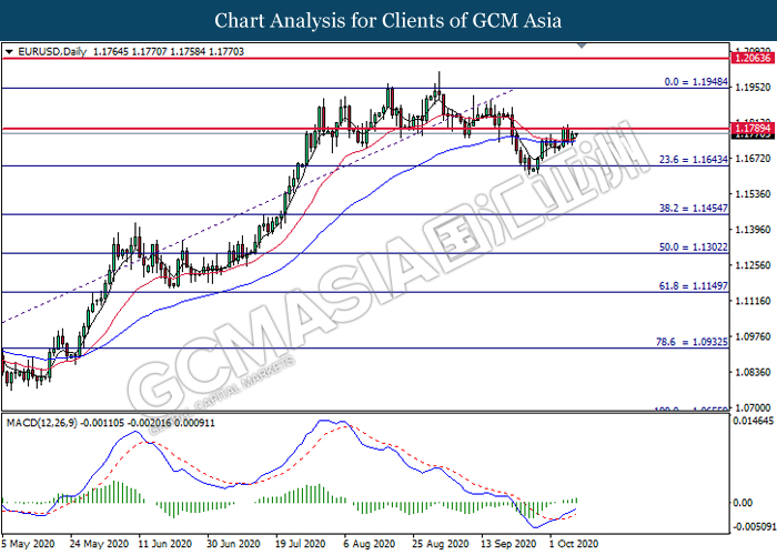 EURUSD, Daily: EURUSD was traded higher while currently testing the resistance level at 1.1790. MACD which illustrate bullish bias momentum signal suggest the pair to extend its gains after it successfully breakout above the resistance level at 1.1790.