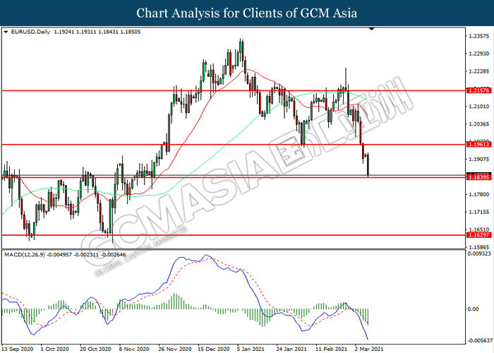 EURUSD, Daily: EURUSD was traded lower while currently testing the support level at 1.1840. MACD which illustrated increasing bearish momentum suggest the pair to extend its losses after it successfully breakout below the support level.