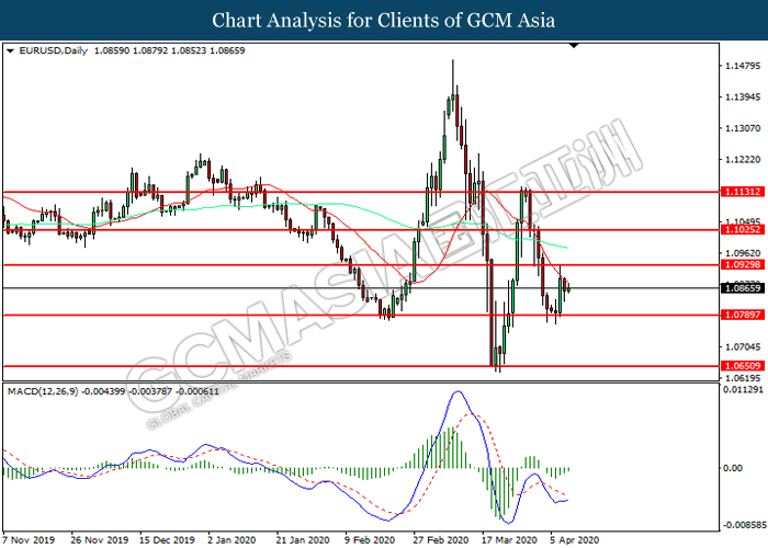 EURUSD, Daily: EURUSD was traded lower following prior retracement from the resistance level at 1.0930. However, MACD which illustrated diminishing bearish momentum suggest the pair to be traded higher in short-term as technical correction.