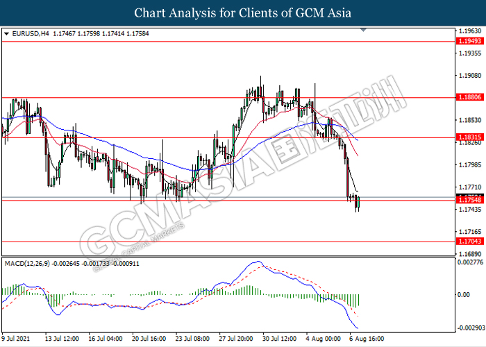 EURUSD, H4: EURUSD was traded lower while currently testing the support level 1.1755. However, MACD which illustrate diminishing bearish momentum signal suggest the pair to experience a technical correction towards the resistance level 1.1830.
