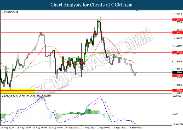 EURUSD, H4: EURUSD was traded lower while currently testing the support level at 1.1765. However, MACD which illustrated diminishing bearish momentum suggest the pair to be traded higher in short-term as technical correction.