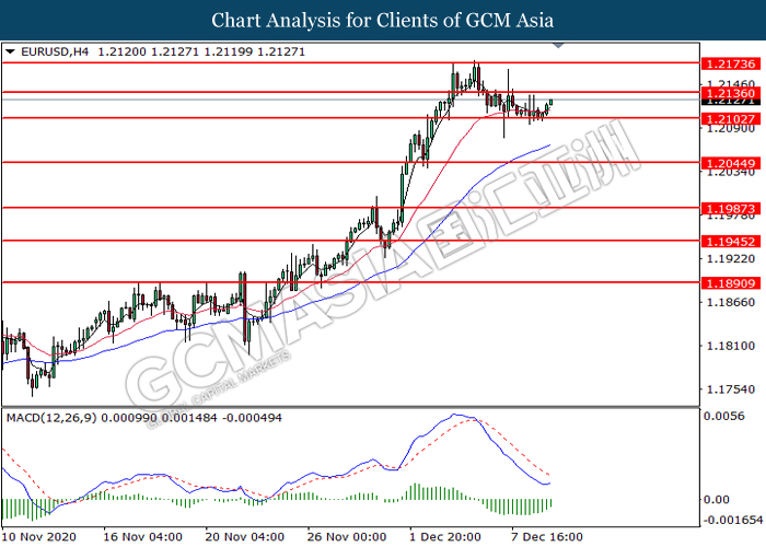 EURUSD, H4: EURUSD was traded higher following prior rebound from the support level at 1.2105. MACD which illustrate diminishing bearish momentum suggest the pair to extend its gains toward the resistance level at 1.2135.