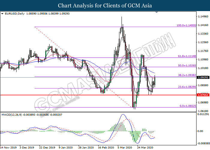 EURUSD, Daily: EURUSD was traded higher while currently testing the resistance level at 1.0940. MACD which illustrate diminishing bearish momentum suggests the pair to extend its gains after it successfully breakout above the resistance level at 1.0940.