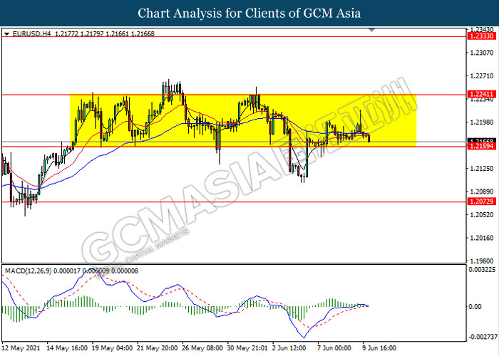 EURUSD, H4: EURUSD remain traded in a sideway channel while currently testing near the support level 1.2160. However, MACD which illustrate diminishing bullish momentum signal with the starting formation of death cross suggest the pair to be traded lower after it breaks below the support level.
