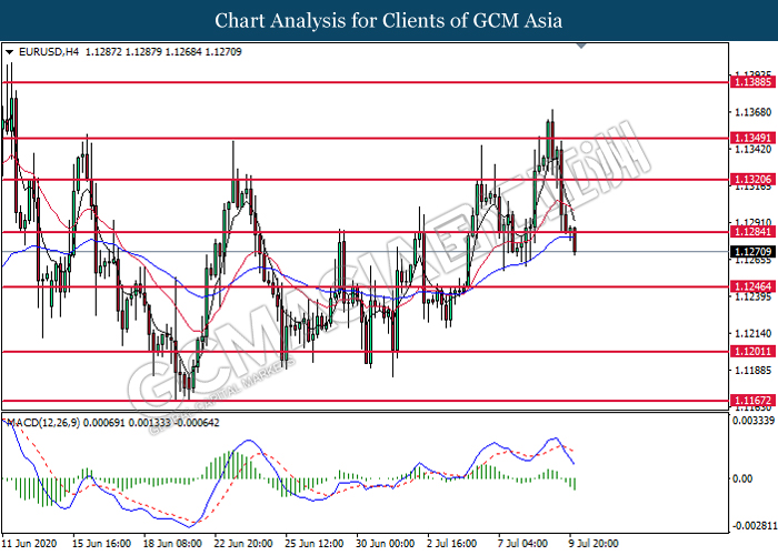 EURUSD, H4: EURUSD was traded lower following prior breakout below the previous support level at 1.1285. MACD which illustrate bearish bias momentum signal suggest the pair to extend its losses toward the support level at 1.1245.