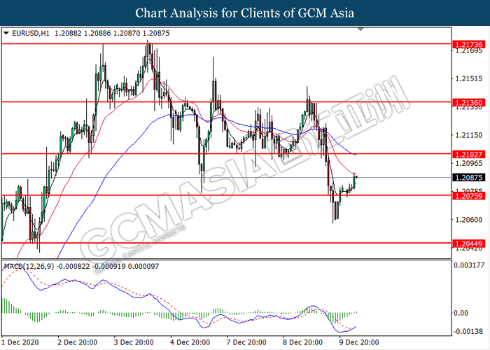 EURUSD, H1: EURUSD was traded higher following prior rebound from the support level at 1.2075. MACD which illustrate diminishing bearish momentum suggest the pair to extend its gains toward the resistance level at 1.2105.