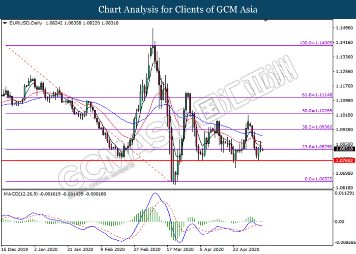 EURUSD, Daily: EURUSD was traded lower below the resistance level at 1.0830. Due to lack of signal from MACD, it is suggested to wait for further confirmation before entering into the market.