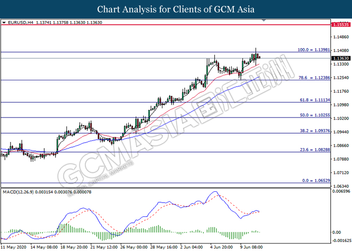 EURUSD, H4: EURUSD was traded higher while currently testing the resistance level at 1.1400. However, MACD which illustrate diminishing bullish momentum signal suggest the pair to undergo technical correction in short term.