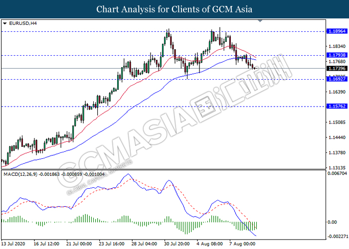 EURUSD, H4: EURUSD was traded lower following prior retracement from the resistance level 1.1795. MACD which illustrate ongoing bearish momentum signal suggest the pair to extend its losses in short term towards the support level 1.1690.