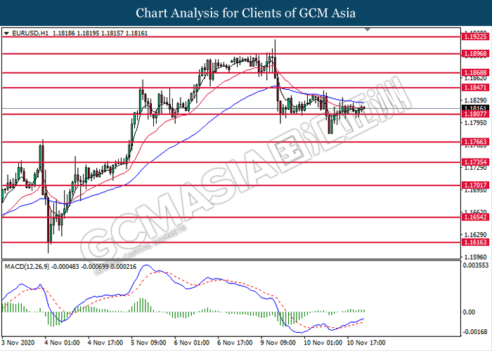 EURUSD, H1: EURUSD was traded higher following prior rebound from the support level at 1.1805. MACD which illustrate bullish bias momentum signal suggest the pair to extend its gains toward the resistance level at 1.1845.