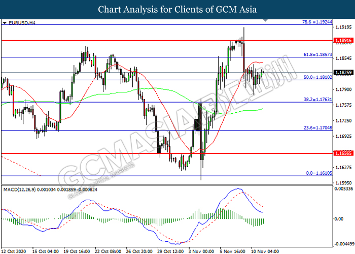 EURUSD, H4: EURUSD was traded higher following prior rebound from the support level at 1.1810. MACD which illustrated diminishing bearish momentum suggest the pair to extend its gains toward resistance level at 1.1855.