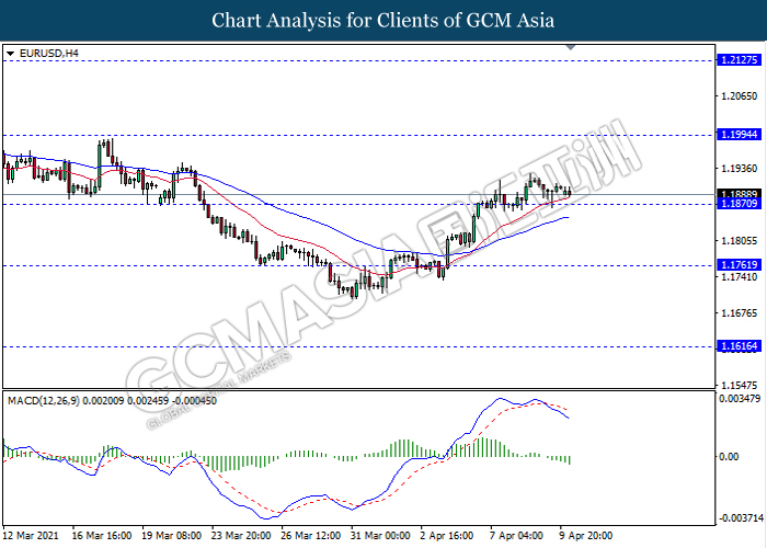 EURUSD, H4: EURUSD was traded flat while currently testing near the support level 1.1870. However, MACD which illustrate bearish momentum signal with the formation of death cross suggest the pair to be traded lower after it breaks below the support level.