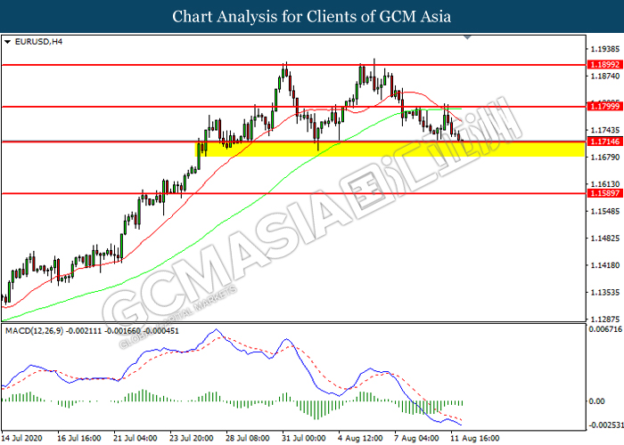 EURUSD, H4: EURUSD was traded lower while currently testing the support level at 1.1715. MACD which illustrated increasing bearish momentum suggest the pair to extend its losses after it successfully breakout below the support level.
