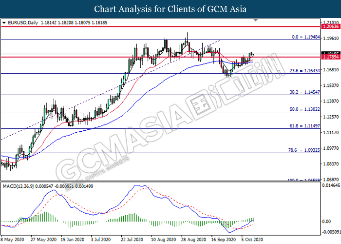 EURUSD, Daily: EURUSD was traded higher following prior breakout above the previous resistnace level at 1.1790. MACD which illustrate bullish bias momentum signal suggest the pair to extend its gains toward the resistance level at 1.1950.