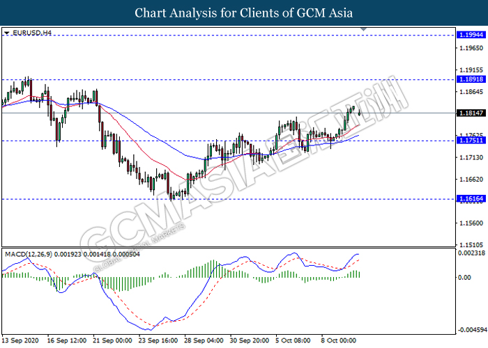 EURUSD, H4: EURUSD was traded higher following recent rebound from the support level 1.1750. However, MACD which display diminishing bullish bias signal suggest the pair to be traded lower in short term as technical correction back towards the support level 1.1750.