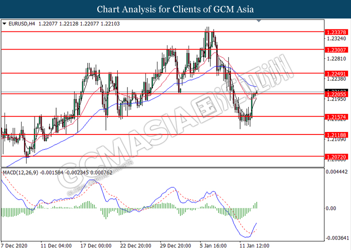 EURUSD, H4: EURUSD was traded higher while currently testing the resistance level at 1.2205. MACD which illustrated bullish bias momentum suggest the pair to extend its gains after it successfully breakout above the resistance level.
