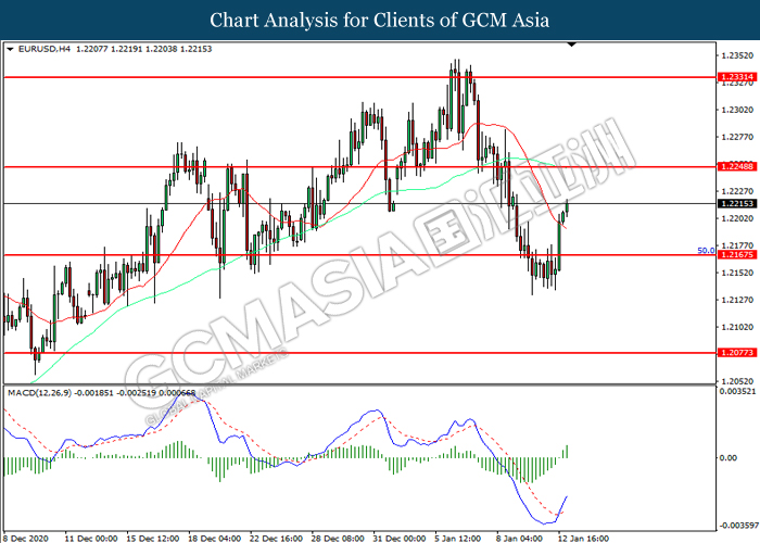 EURUSD, H4: EURUSD was traded higher following prior rebound from the support level at 1.2165. MACD which illustrated increasing bullish momentum suggest the pair to extend its gains toward resistance level at 1.2250.