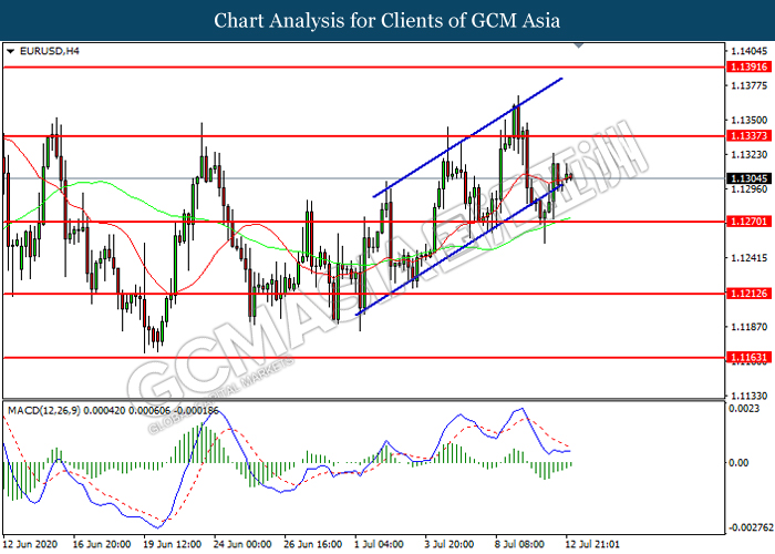 EURUSD, H4: EURUSD was traded higher following prior rebound from the support level at 1.1270. MACD which illustrated diminishing bearish momentum suggest the pair to extend its gains toward resistance level at 1.1335.
