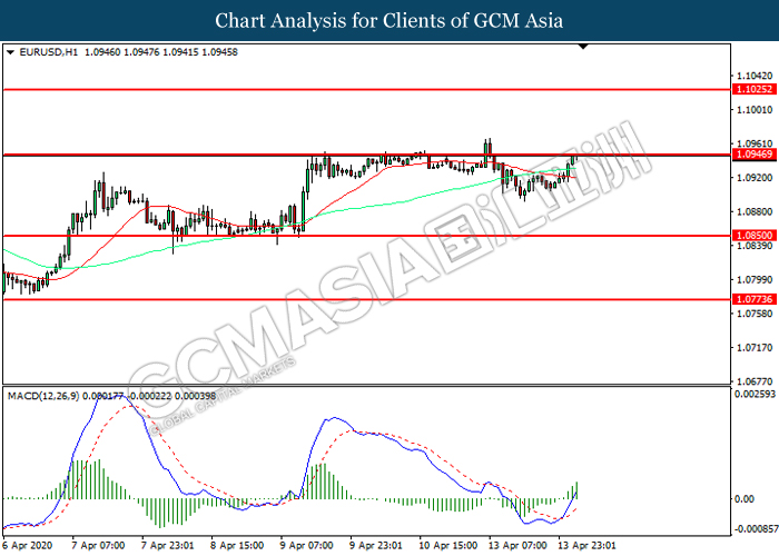 EURUSD, H1: EURUSD was traded higher while currently testing the resistance level at 1.0945. MACD which illustrated increasing bullish momentum suggest the pair to extend its gains after it successfully breakout above the resistance level.