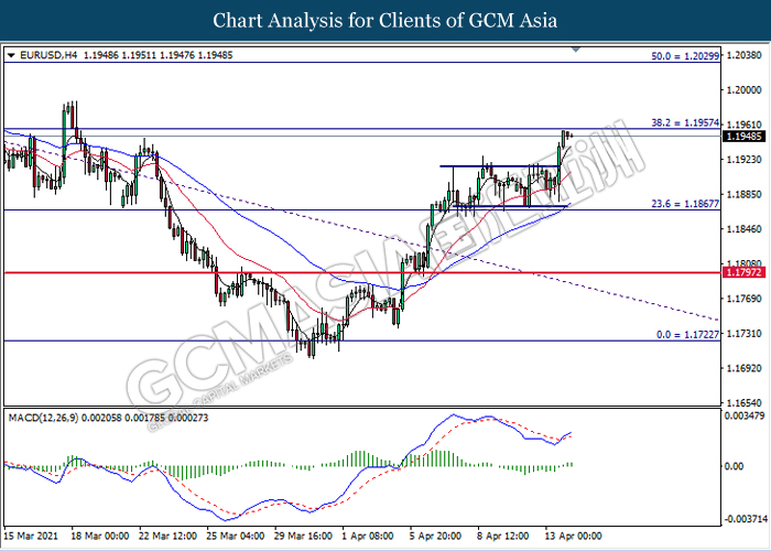 EURUSD, H4: EURUSD was traded higher while currently testing the resistance level at 1.1955. MACD which illustrated bullish bias momentum signal suggest the pair to extend its gains after it successfully breakout above the resistance level.