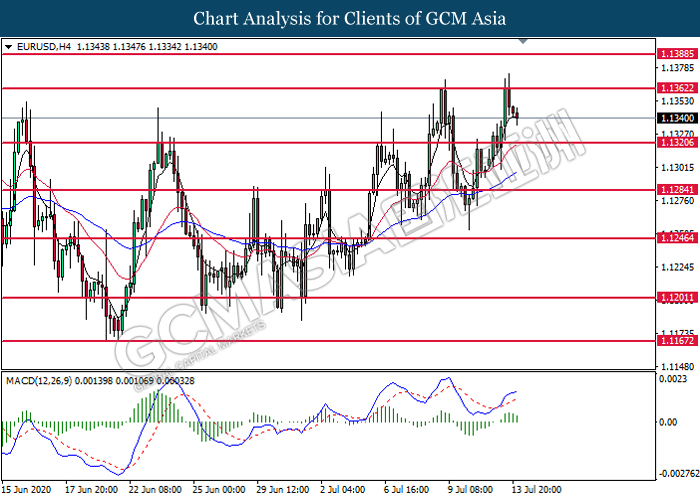 EURUSD, H4: EURUSD was traded lower following prior retracement from the resistance level at 1.1360. MACD which illustrate diminishing bullish momentum signal suggest the pair to extend its losses toward the support level at 1.1320.