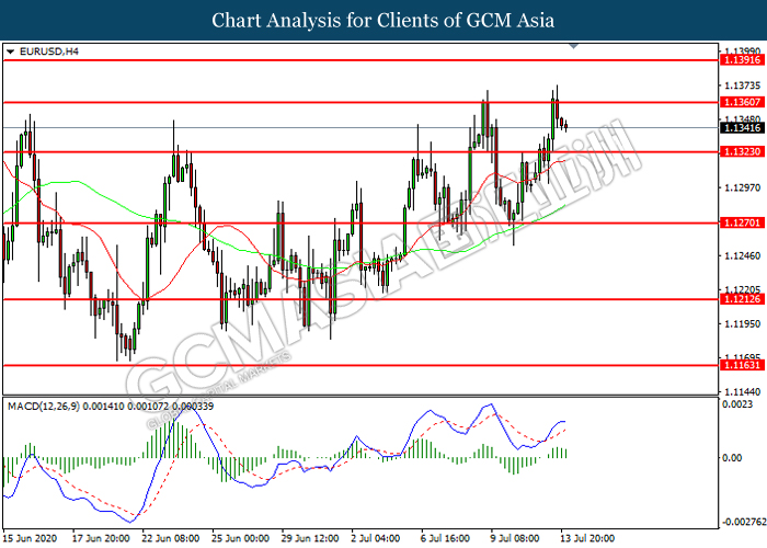 EURUSD, H4: EURUSD was traded lower following prior retracement from the resistance level at 1.1360. MACD which illustrated diminishing bullish momentum suggest the pair to extend its losses toward support level at 1.1325.