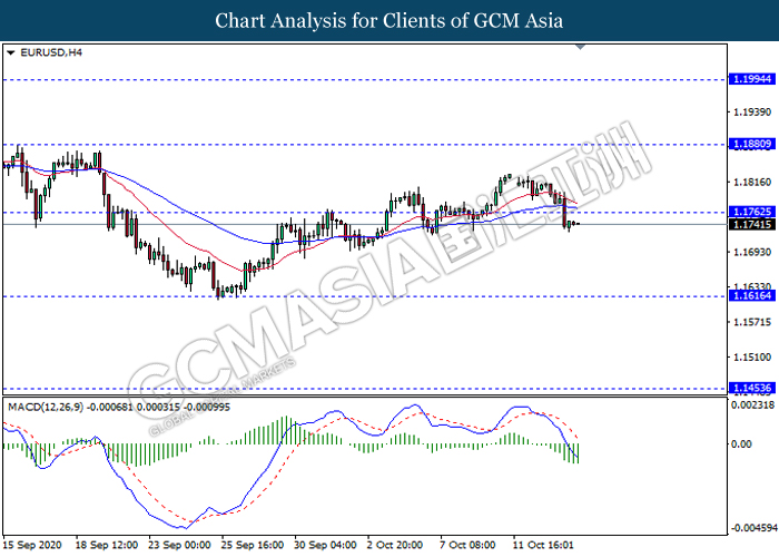 EURUSD, H4: EURUSD was traded lower following prior breakout below the previous support level 1.1760. MACD which illustrate bearish bias signal suggest the pair to extend its losses towards the support level 1.1615.