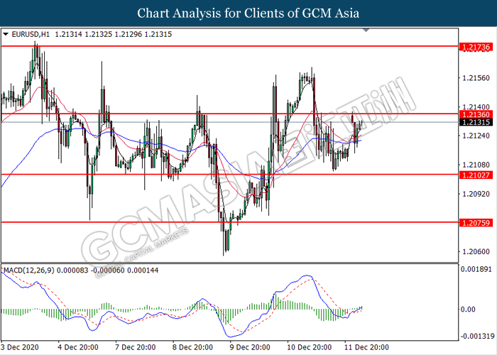 EURUSD, H1: EURUSD was traded higher following prior rebound from the support level at 1.2105. MACD which illustrate bullish bias momentum suggest the pair to extend its gains toward the resistance level at 1.2135.