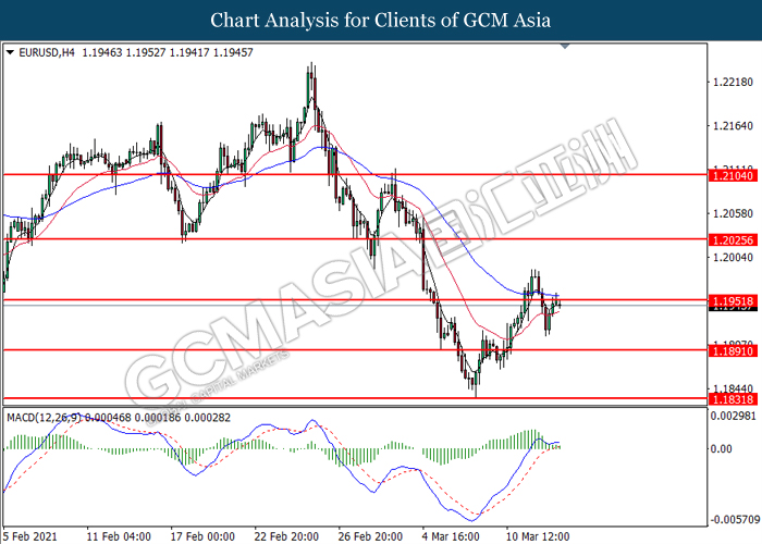 EURUSD, H4: EURUSD was traded higher while currently testing the resistance level at 1.1950. MACD which illustrated bullish bias momentum suggest the pair to extend its gains after it successfully breakout above the resistance level at 1.1950.