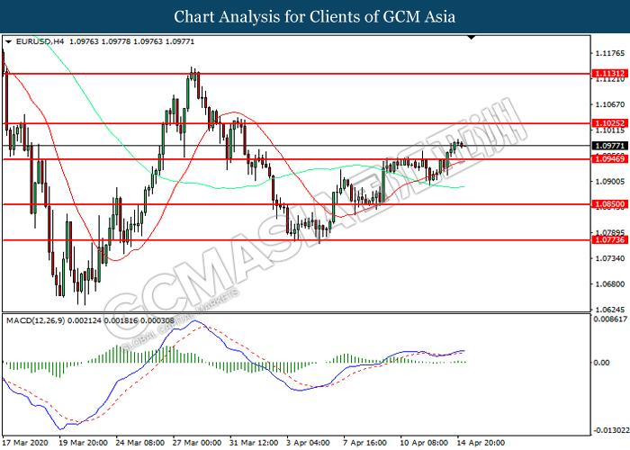 EURUSD, H4: EURUSD was traded higher following prior breakout above the previous resistance level at 1.0945. However, MACD which illustrated diminishing bullish momentum suggest the pair to be traded lower in short-term as technical correction.
