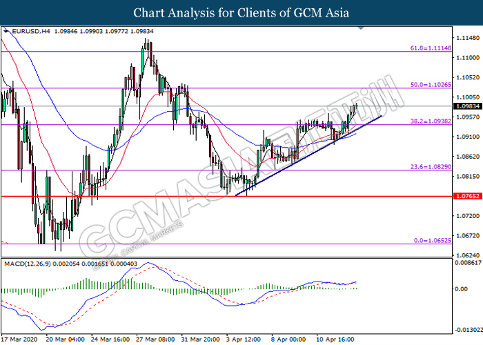 EURUSD, H4: EURUSD was traded higher following prior breakout above the previous resistance level at 1.0940. MACD which illustrate bullish bias momentum suggests the pair to extend its gains toward the resistance level at 1.1025.