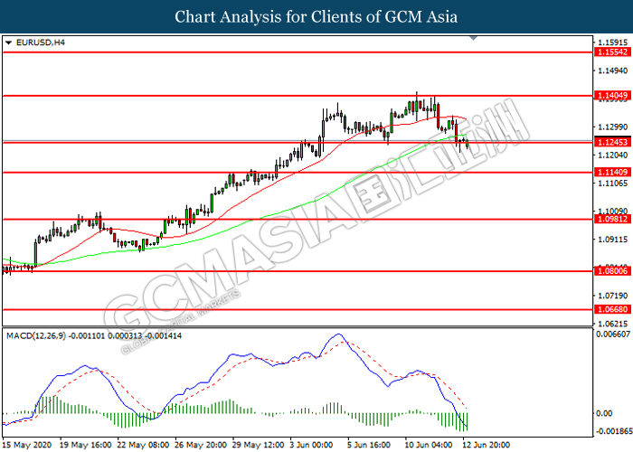 EURUSD, H4: EURUSD was traded lower while currently testing the support level at 1.1245. However, MACD which illustrated diminishing bearish momentum suggest the pair to be traded higher in short-term as technical correction.