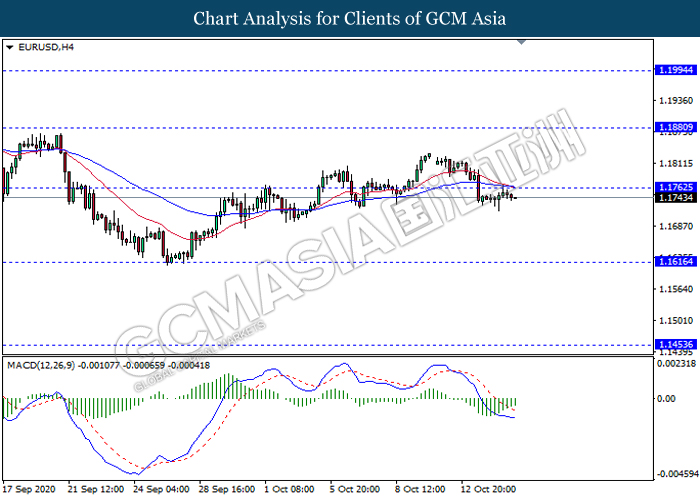 EURUSD, H4: EURUSD was traded flat near the resistance level 1.1760. However, MACD which illustrate bearish bias signal suggest the pair to be traded lower towards the support level 1.1615.