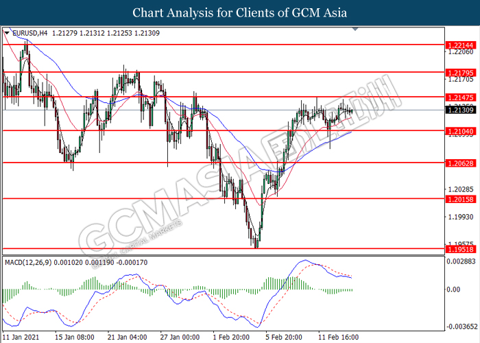 EURUSD, H4: EURUSD was traded higher following prior rebound from the support level at 1.2105. MACD which illustrated diminishing bearish momentum suggest the pair to extend its gains toward the resistance level at 1.2145.