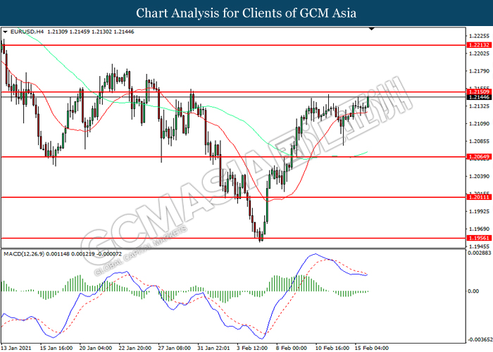EURUSD, H4: EURUSD was traded higher while currently testing the resistance level at 1.2150. MACD which illustrated diminishing bearish momentum suggest the pair to extend its gains after it successfully breakout above the resistance level.