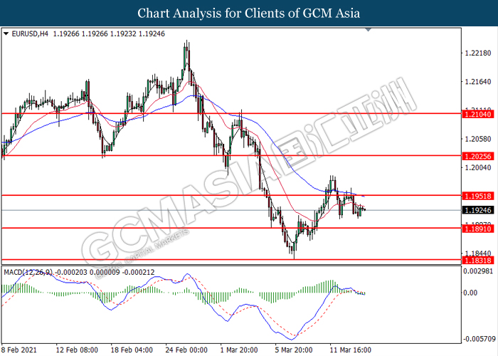EURUSD, H4: EURUSD was traded lower following prior retracement from the resistance level at 1.1950. MACD which illustrated bearish bias momentum suggest the pair to extend its losses toward the support level at 1.1890.