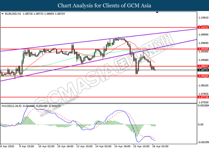 EURUSD, H1: EURUSD was traded lower following prior breakout below the previous support level at 1.0885. MACD which illustrated increasing bearish momentum suggest the pair to extend its losses toward support level at 1.0850.