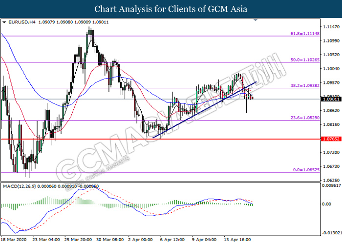 EURUSD, H4: EURUSD was traded lower following prior breakout below the upward trendline. MACD which illustrate bearish bias momentum suggests the pair to extend its losses toward the support level at 1.0830.