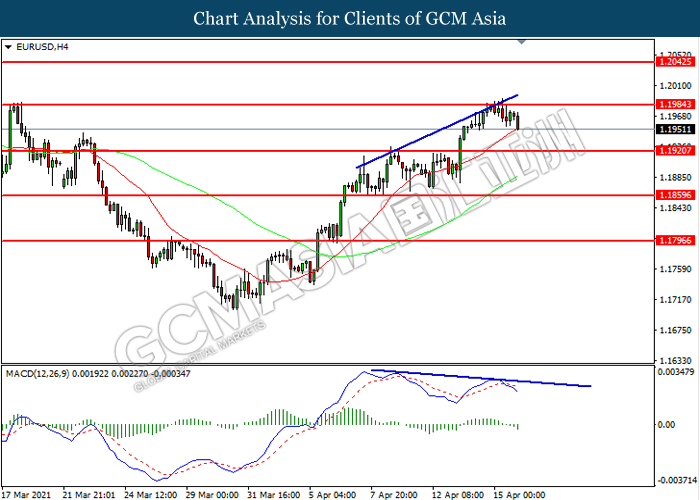 EURUSD, H4: EURUSD was traded lower following prior retracement from the resistance level at 1.1985. MACD which illustrated increasing bearish momentum suggest the pair to extend its losses toward support level at 1.1920.