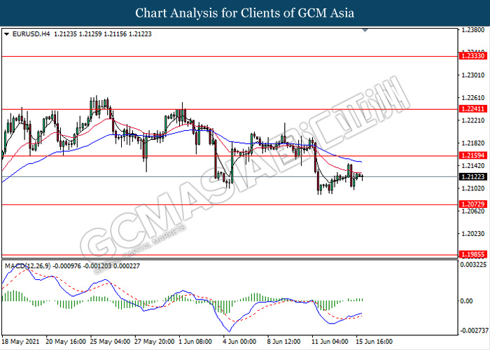 EURUSD, H4: EURUSD was traded flat following recent retracement from its high level. However, MACD which illustrate bullish momentum signal with the formation of golden cross suggest the pair to be traded higher in short term towards the resistance level 1.2160.