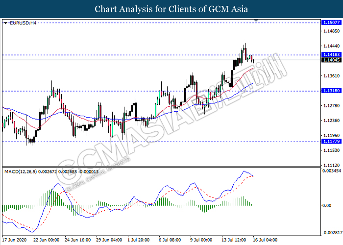 EURUSD, H4: EURUSD was traded lower following prior retracement from the resistance level 1.1420. MACD which illustrate diminishing bullish momentum with the starting formation of death cross suggest the pair to extend its retracement towards the support level 1.1320.